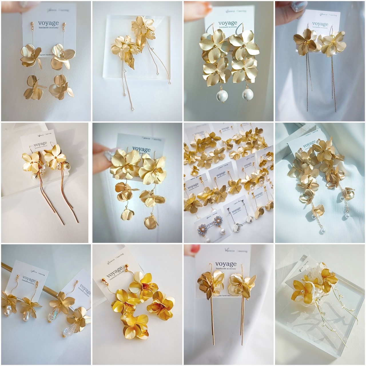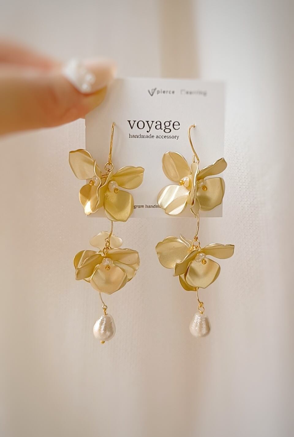 こちらはゴールドカラーの小花に国産のコットン&淡水パールを組み合わせた大人可愛いデザインになります。