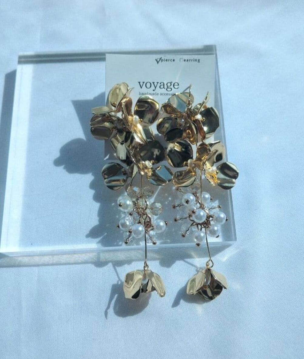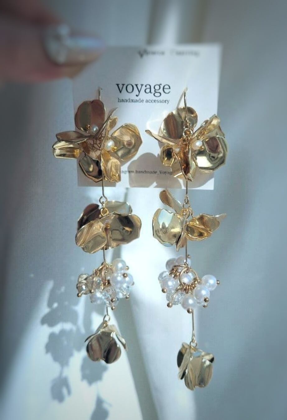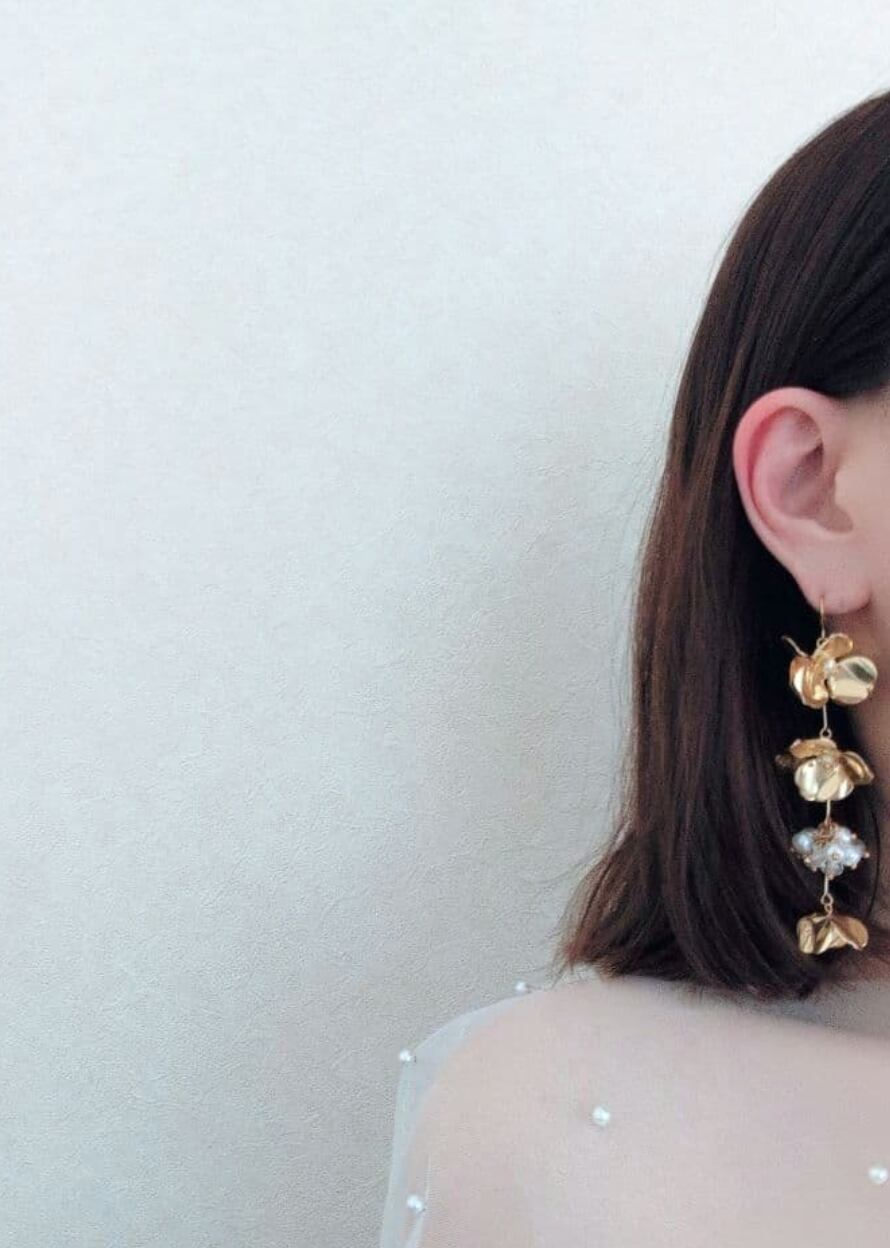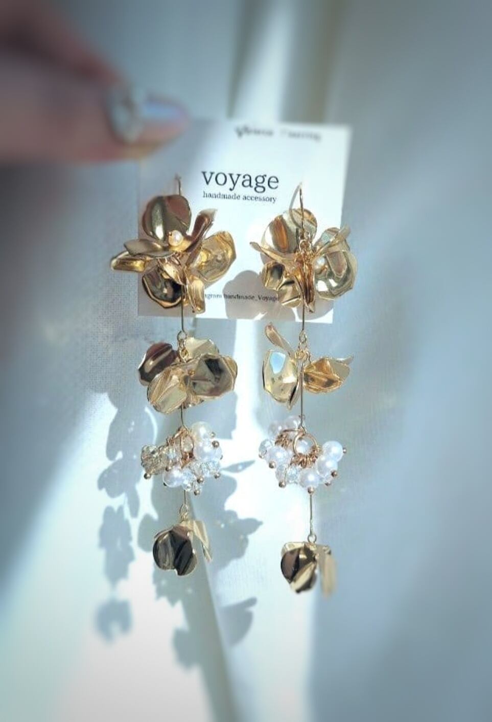 ゴールドの花びらに淡水パールとフラワーパーツを組み合わせた大人可愛いデザインになります。