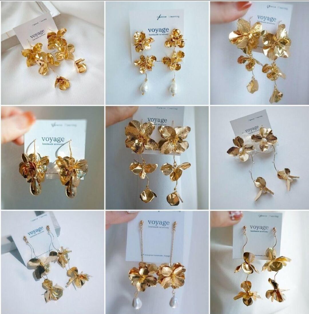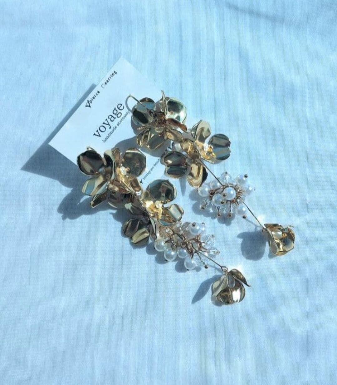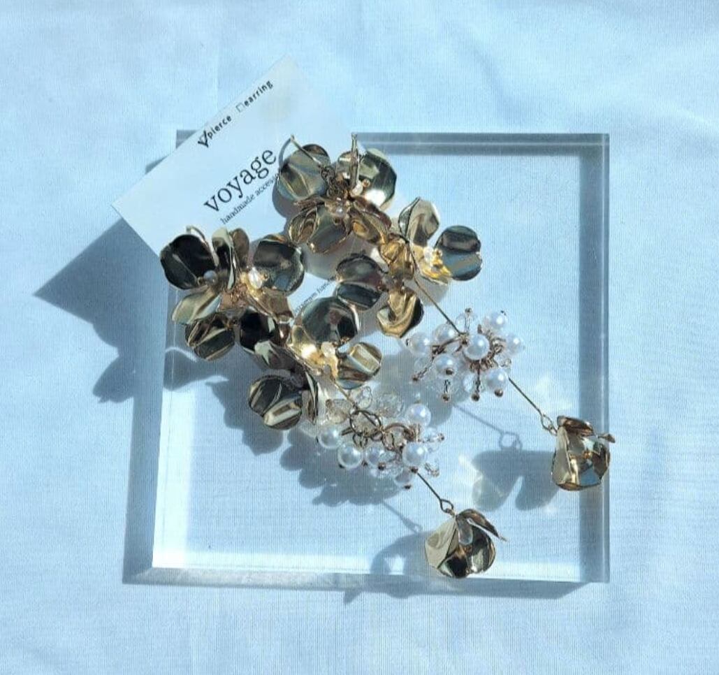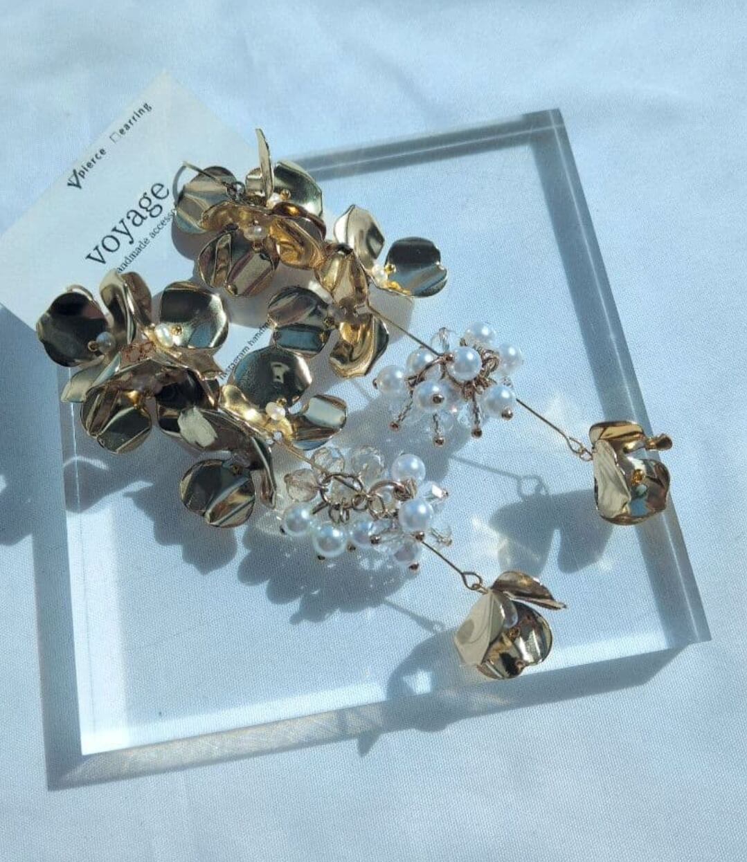 ゴールドの花びらに淡水パールとフラワーパーツを組み合わせた大人可愛いデザインになります。