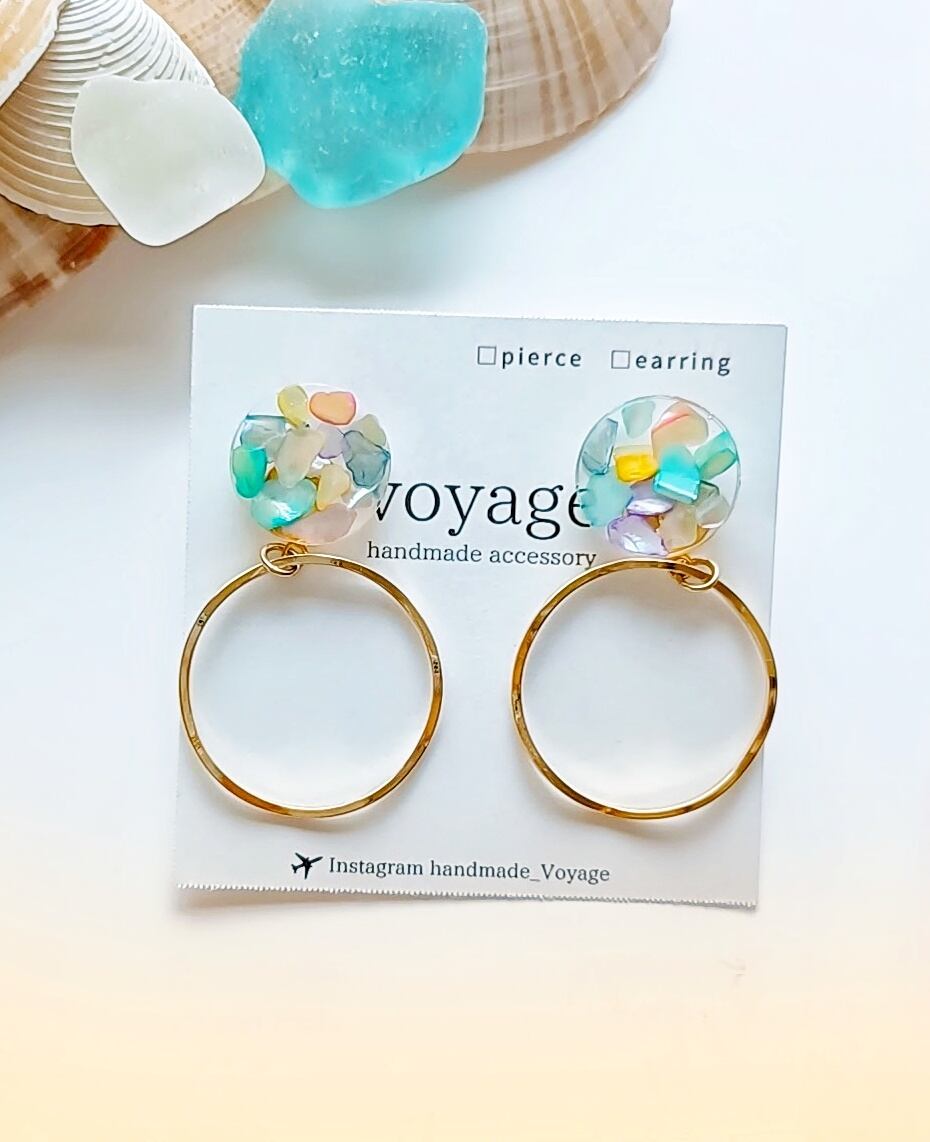 ハンドメイド ピアス 2way シェルレジン ゴールド フープ イヤリング