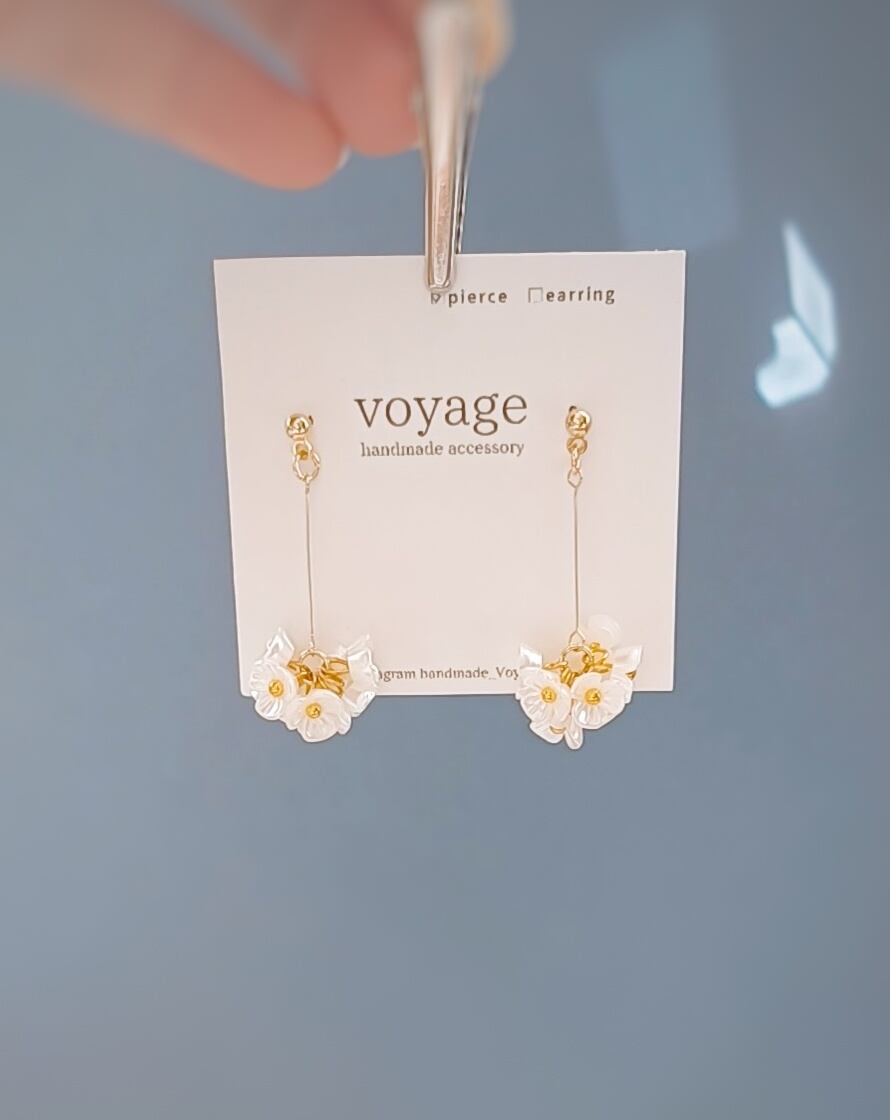 ホワイトフラワーのビーズが女性らしい大人可愛いデザインのピアスに仕上げました。