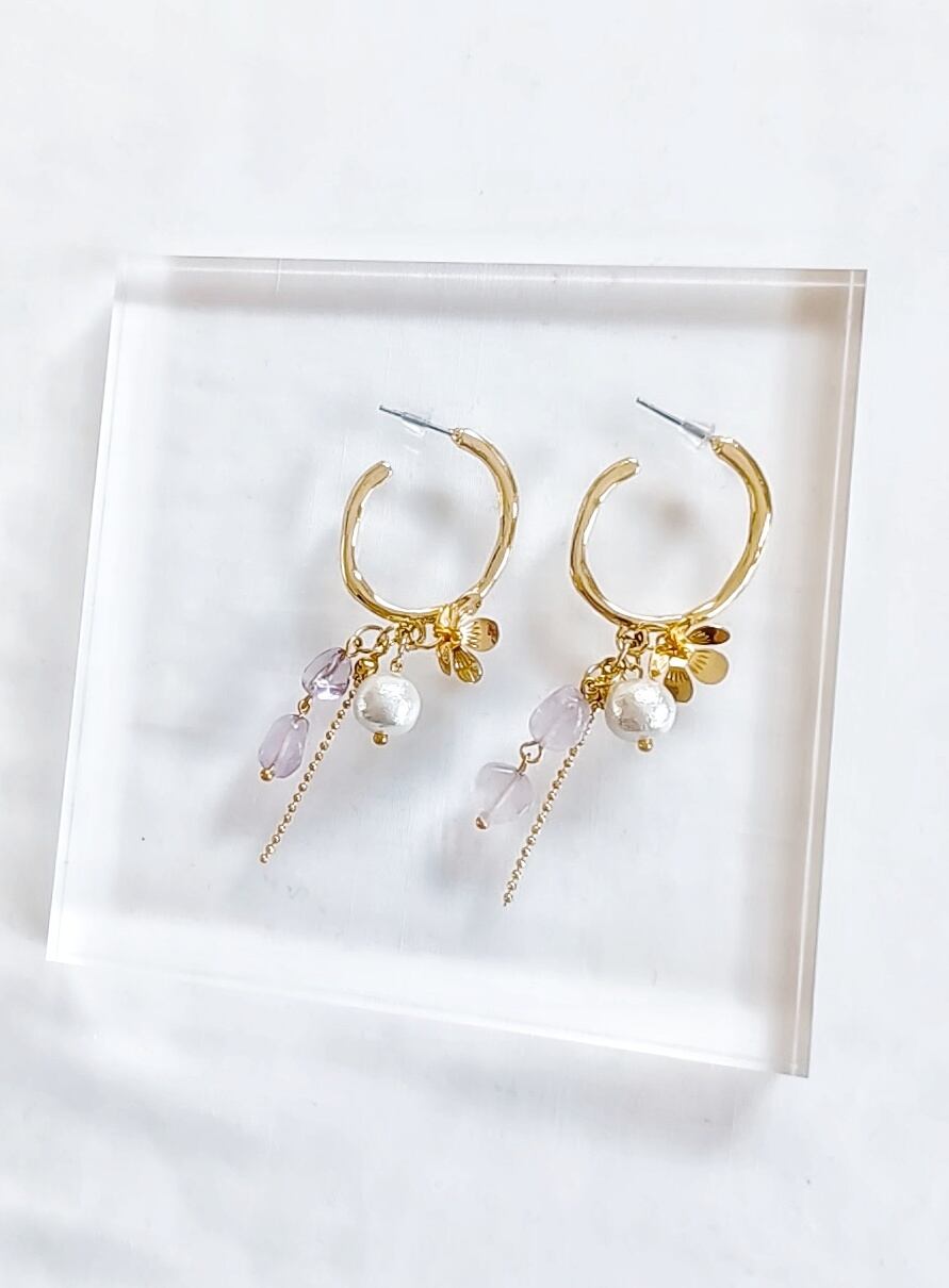 こちらは天然石、国産コットンパール、メタルフラワーを使い細めのチェーンを合わせました。