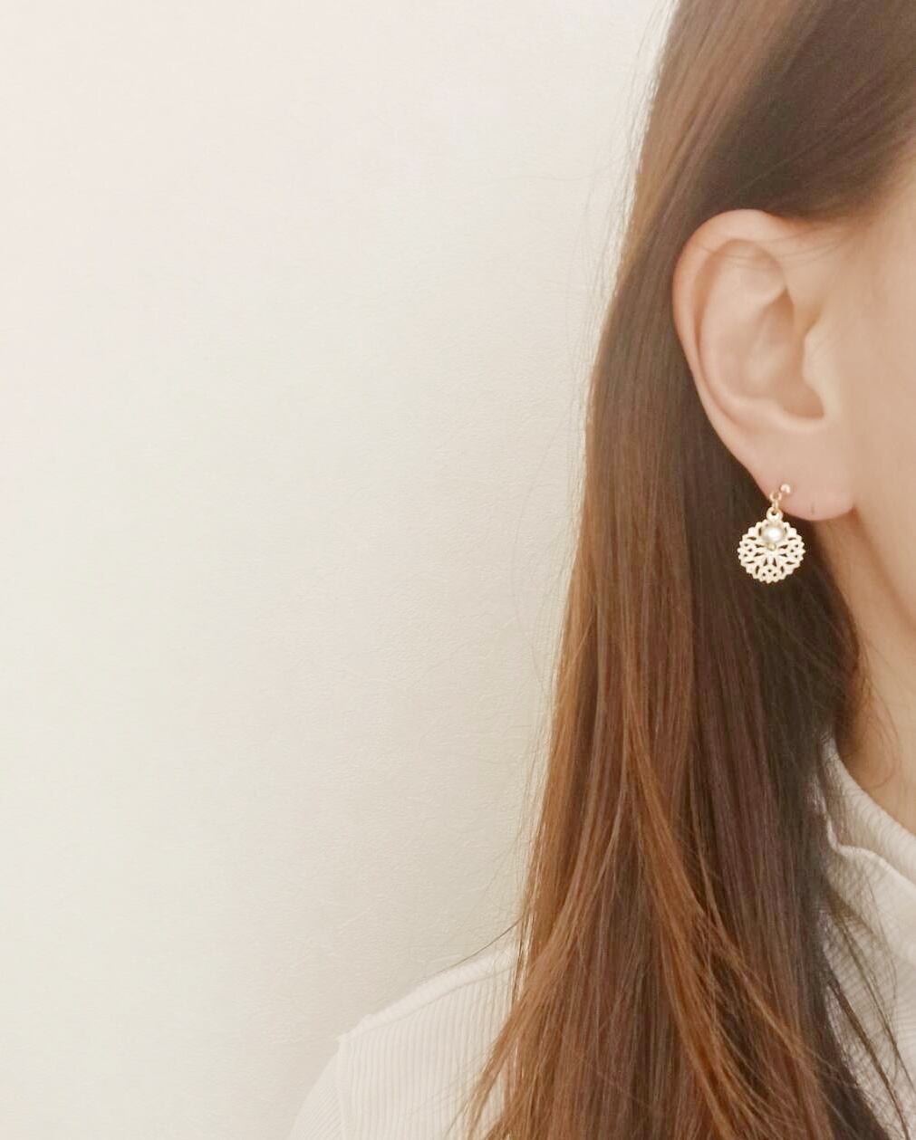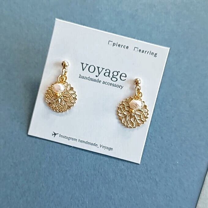 メタルゴールドフラワーと、淡水パールが女性らしい大人可愛いデザインのピアスに仕上げました。