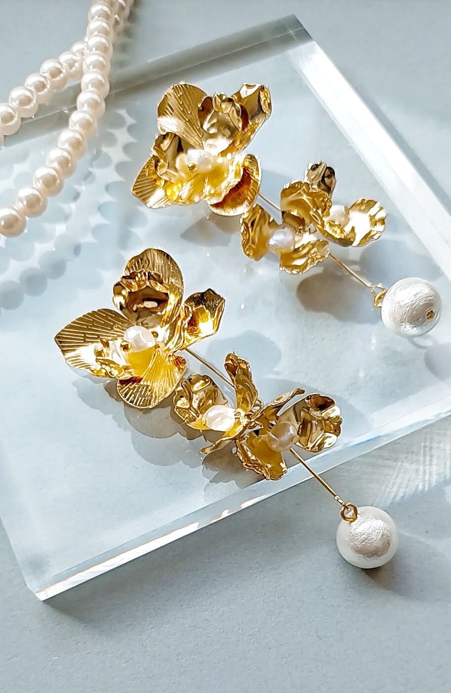 ゴールドの花びらに淡水とコットンパールを組み合わせた大人可愛いデザインになります。