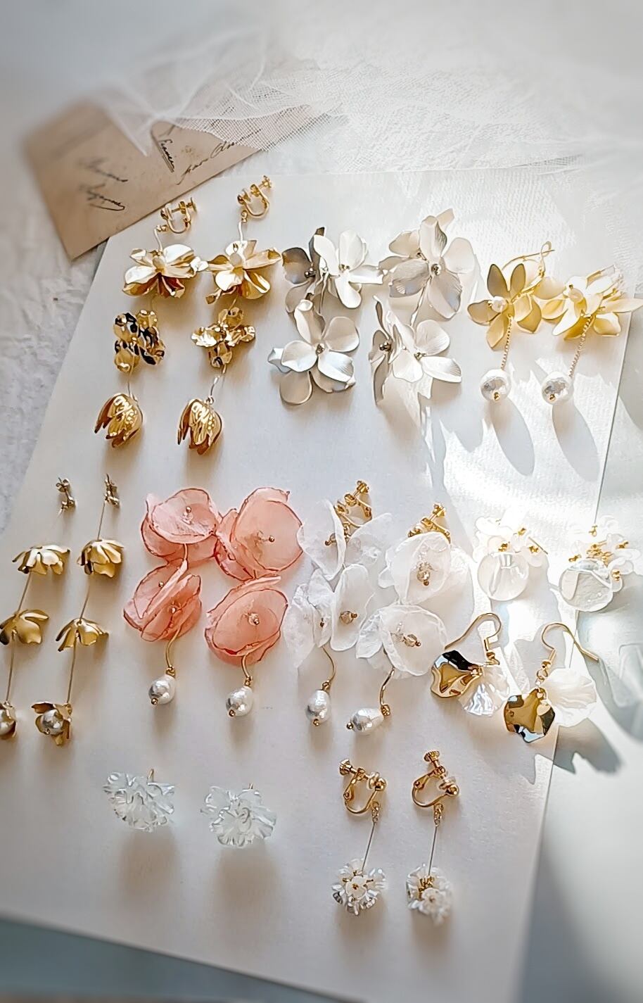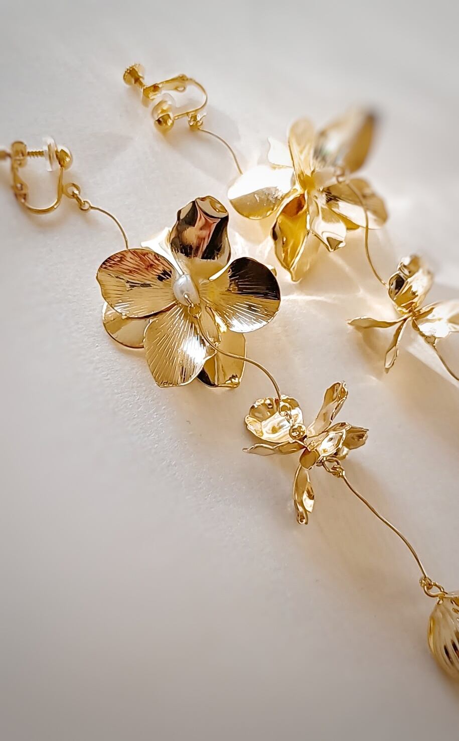 ゴールドの花びらに淡水パールとフラワーパーツを組み合わせた大人可愛いデザインになります。