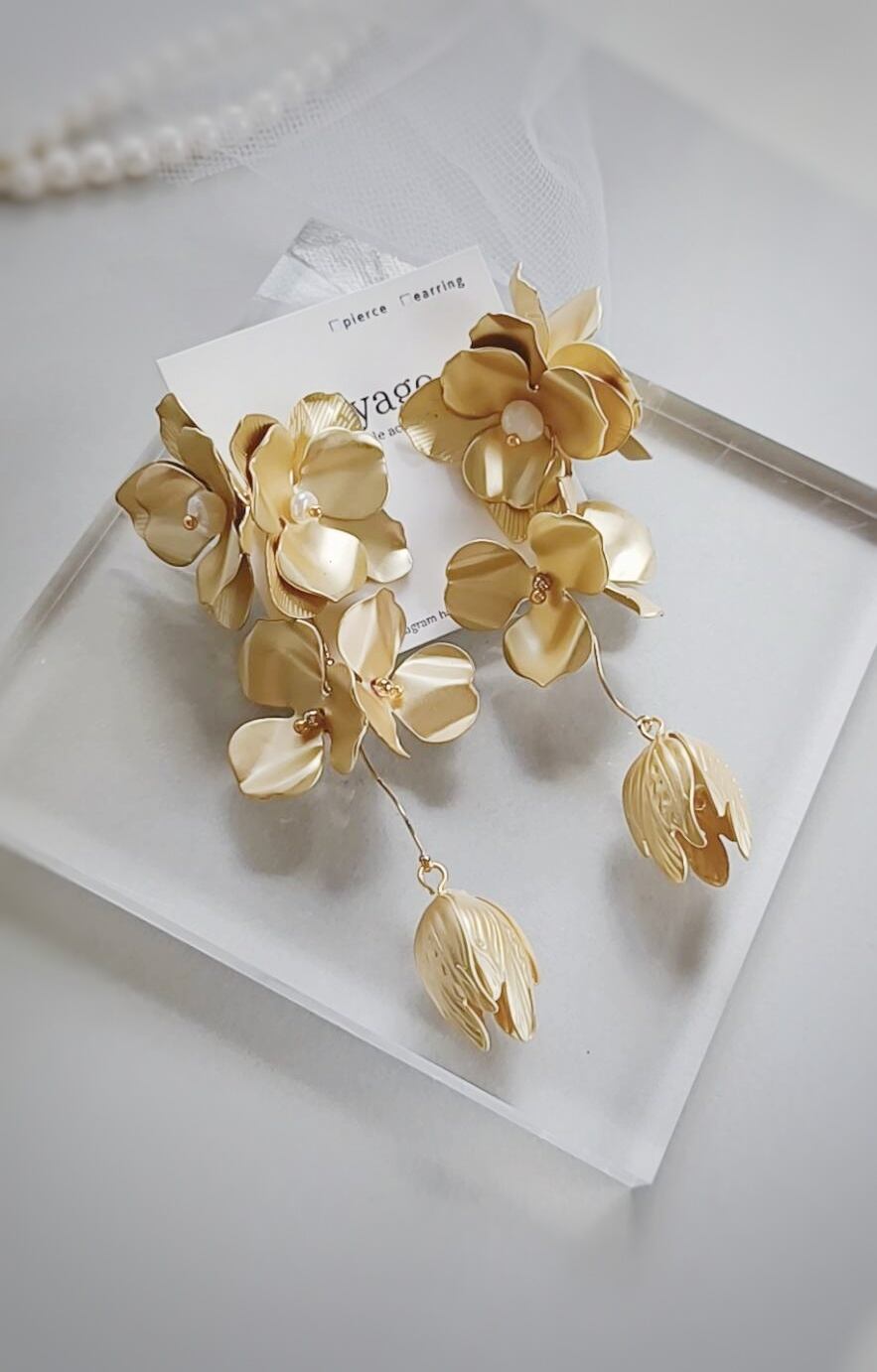 マットゴールドの花びらに淡水パールとフラワーパーツを組み合わせた大人可愛いデザインになります。