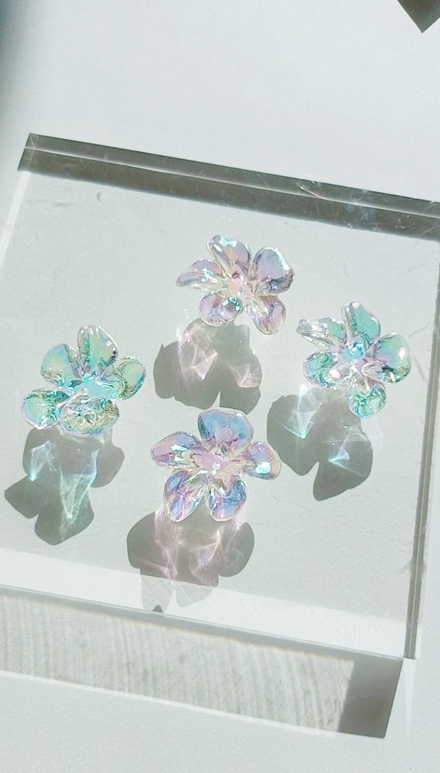 オーロラフラワーにパール、日本製のスワロフスキーを組み合わせた女性らしい大人可愛いデザインのピアスに仕上げました。