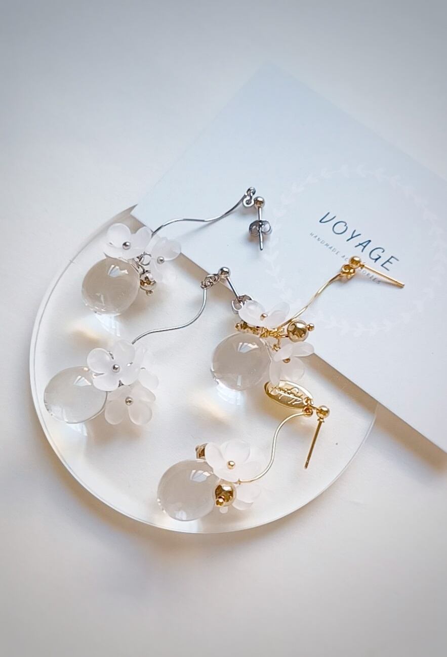 どんなシーンでも華やかさを引き立てる、ホワイトフラワーとクリアビーズのピアスです。