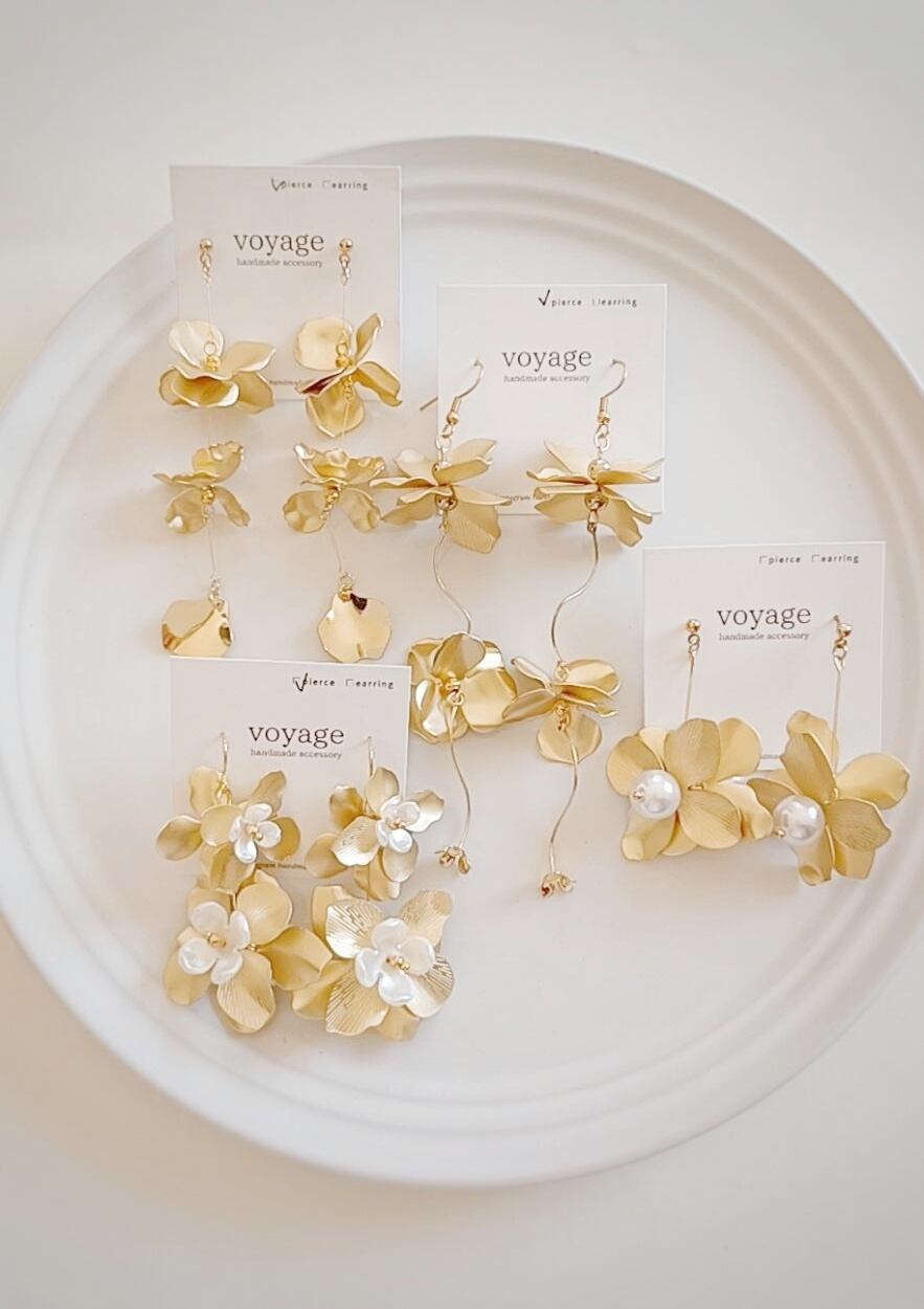 マットゴールドの花びらにホワイトフラワーパーツを組み合わせた大人可愛いデザインになります。