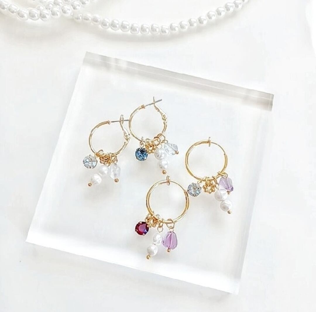 こちらは国産スワロフスキー、天然石(クリスタル)、淡水パールなどを使った大人可愛いデザインです。